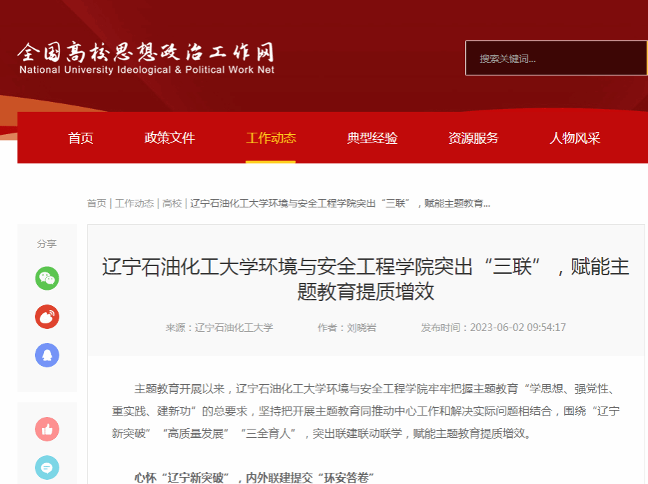 编者按:近日,全国高校思想政治工作网对我校环境与安全工程学院牢牢把握主题教育“学思想、强党性、重实践、建新功”的总要求,坚持把开展主题教育同推动中心工作和解决实际问题相结合,围绕“辽宁新突破”“高质量发展”“三全育人”,突出联建联动联学,赋能主题教育提质增效进行了宣传报道。现将相关报道转载如下: