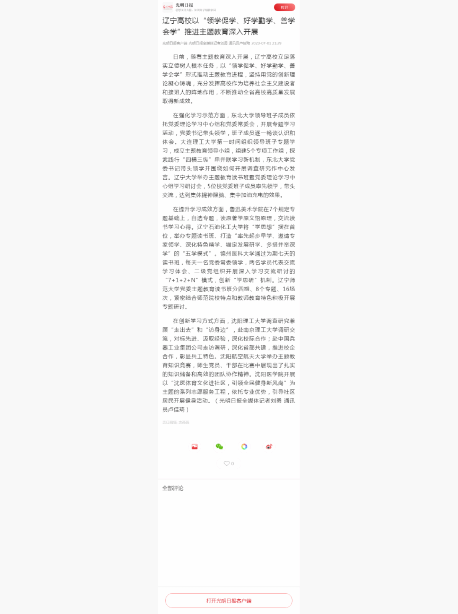 编者按:近日,光明日报客户端、辽宁高校思政微信公众号等媒体平台对辽宁高校立足落实立德树人根本任务,以“领学促学、好学勤学、善学会学”形式推动主题教育进程,坚持用党的创新理论凝心铸魂,充分发挥高校作为培养社会主义建设者和接班人的阵地作用,不断推动全省高校高质量发展取得新成效进行了宣传,其中对我校将“学思想”摆在首位,举办专题读书班、打造“率先起步早学、邀请专家领学、深化特色精学、锚定发展研学、多措并举深学”的“五学模式”进行了报道。现将相关报道转载如下: