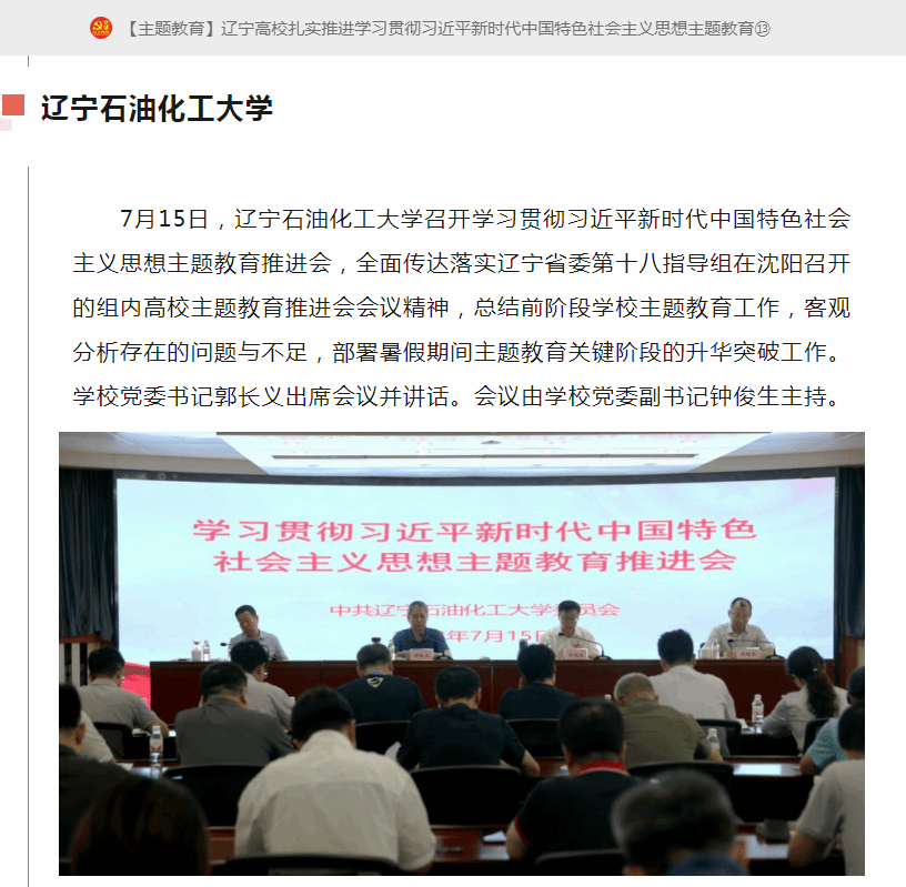 编者按:近日,辽宁高校党建微信公众号对辽宁高校认真学习贯彻习近平总书记重要讲话精神和党中央部署要求,紧紧锚定目标任务,全面落实重点措施,组织召开推进会、培训会等,推进主题教育各项工作有力有序开展,确保主题教育取得实实在在的成效进行了宣传。其中,对我校召开学习贯彻习近平新时代中国特色社会主义思想主题教育推进会,全面传达落实辽宁省委第十八指导组在沈阳召开的组内高校主题教育推进会会议精神进行了报道。现将相关报道转载如下: