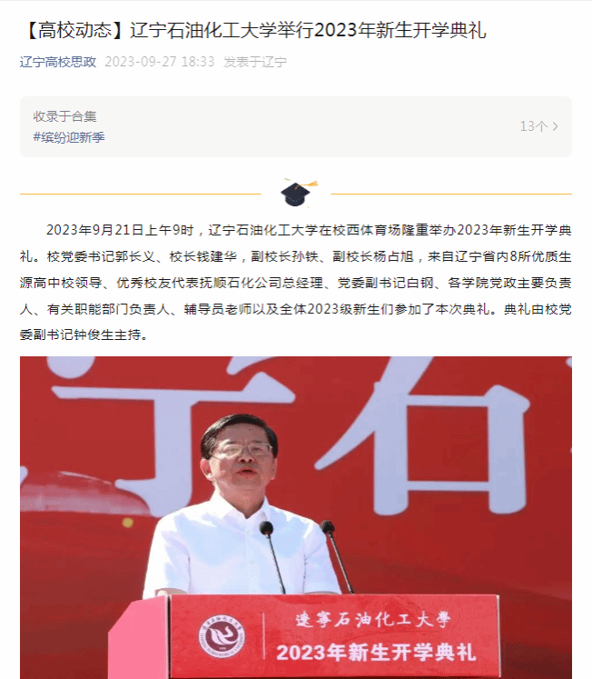 编者按:近日,辽宁高校思政微信公众号对我校在校西体育场隆重举办2023年新生开学典礼进行了宣传报道。现将相关报道转载如下: