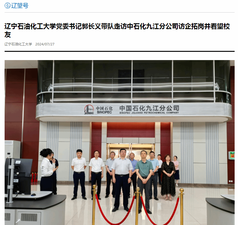 编者按:7月27日,辽宁日报·辽望号、人民日报客户端·人民号对我校党委书记郭长义带队专程赴中石化九江分公司(以下简称“九江石化”)调研交流、看望校友进行了宣传报道。现将相关报道转载如下:
