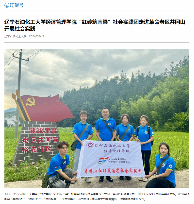 编者按:经济管理学院“红砖筑南梁”社会实践团前往全国青少年井冈山革命传统教育基地,开启了为期9天的社会实践之旅。此次实践围绕“学思结合”“访察探究”“讲传培育”三大举措展开,有力增强了青年学生的爱国情怀、探索精神与责任担当。人民日报客户端•人民号、辽宁日报•辽望号对此进行了宣传报道。现将相关报道转载如下: