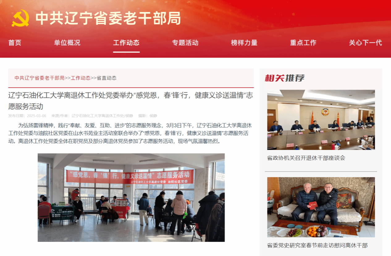 编者按:近日,中共辽宁省委老干部局官网登载了我校离退休工作处撰写的文章《国产亚洲综合一区二区三区_亚洲欧美日韩中文天堂_尤物在线观看视频不卡无码_国产最新精品亚洲2025不卡_亚洲成Av人在线观看片水蜜桃离退休工作处党委举办“感党恩,春‘锋’行,健康义诊送温情”志愿服务活动》。现将相关报道转载如下: