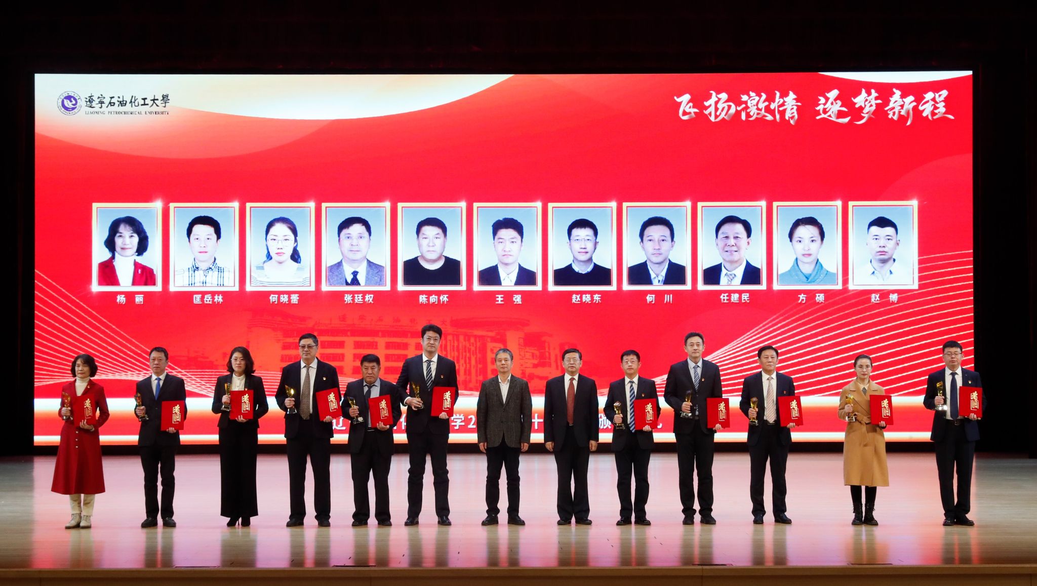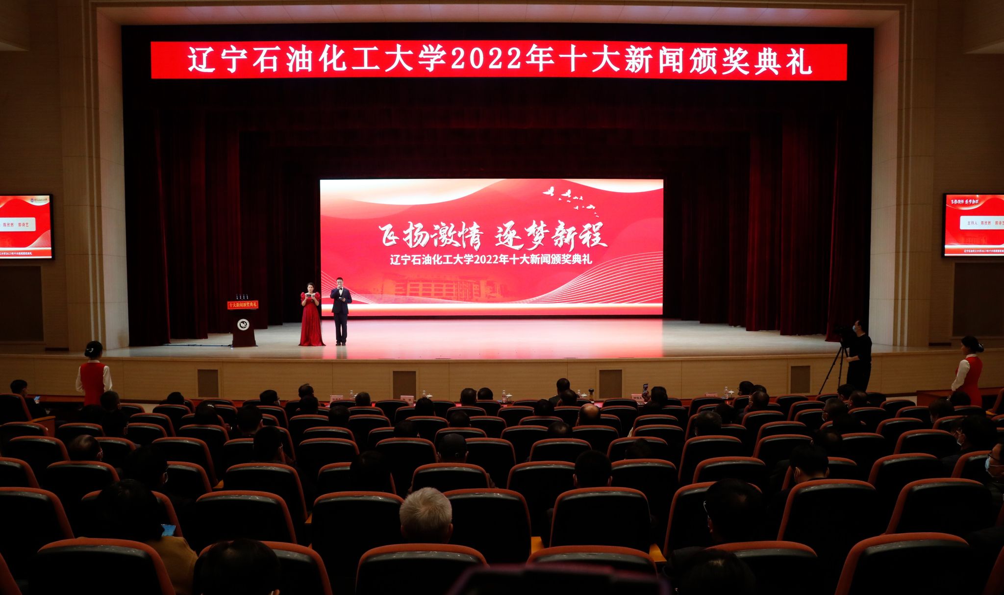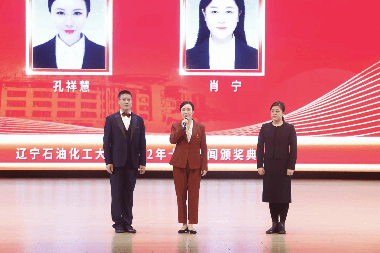 党委宣传部以学校2022年十大新闻为主线制作的宣传片为颁奖典礼开篇,深情回望辽石化大人写满汗水和收获的2022年。随后,专题片依次揭晓2022年度学校“十大新闻”。校领导登台为获奖者代表颁奖,以表彰和感谢他们为学校发展付出的艰辛努力、作出的突出贡献,勉励他们勇担新使命、奋进新征程。