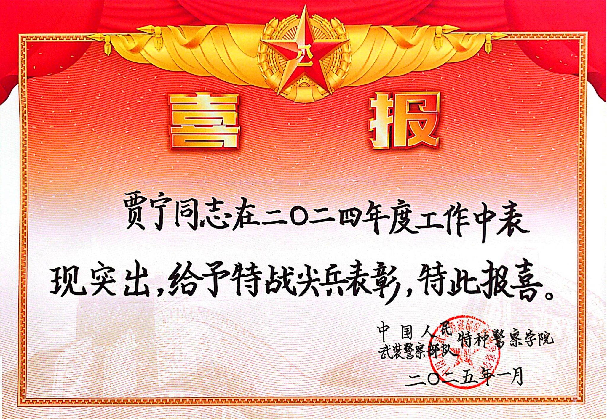 近日,中国人民武装警察部队特种警察学院向学校发来喜报。我校原能源化工工程专业1701班学生,现中国人民武装警察部队特种警察学院学员贾宁,在2024年12月举办的第二届新时代全军院校生长军官领导力培养教学创新竞赛中荣获全军一等奖。2025年1月,被武警特种警察学院评为“特战尖兵”,荣获三级表彰,记嘉奖一次。